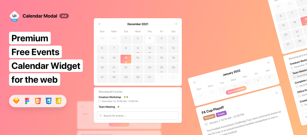 This widget is a Premium Events Calendar built from the ground up for the web. A single JSON array controls the data sourced within the widget which allows for easily customizable event displays & content.